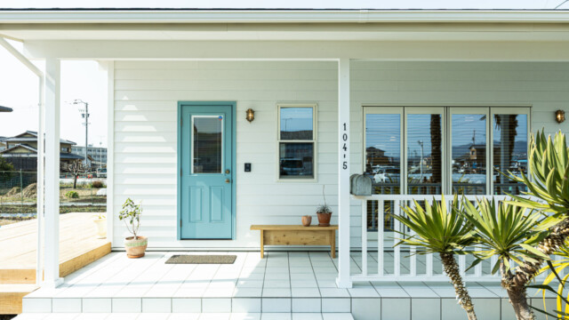 米軍ハウスをイメージしたアメリカンハウス。カバードポーチには、いつまでも劣化しないようタイルデッキを。オリジナルタイルで油汚れが水で擦り落とせるタイルを使用。外壁には、ラップサイディングのホワイト。屋根は、シングル材を使用。玄関ドアのライトブルーが可愛くアクセントになってます。西海岸を想起させるおしゃれな外観の家に仕上がりました。