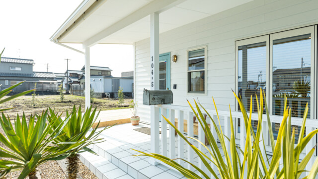 カバードポーチのある白い外観