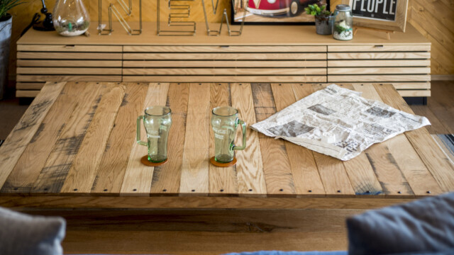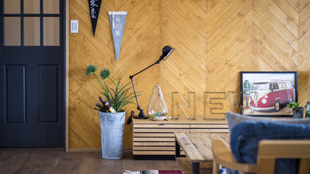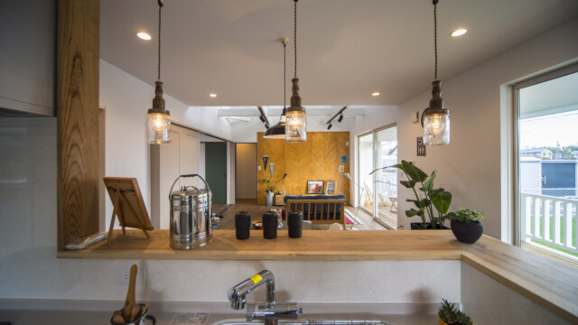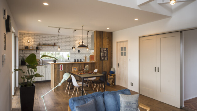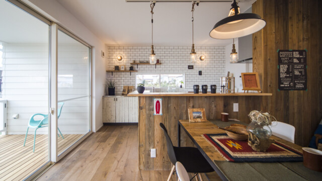 - 内装:無垢のフローリング、アイアン・古材の組み合わせ、カジュアルなキッチン・洗面
