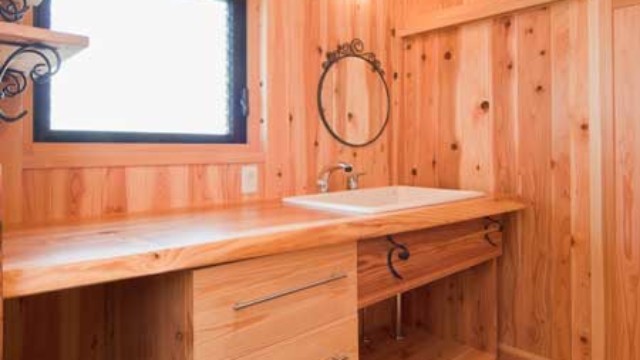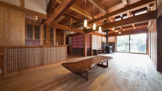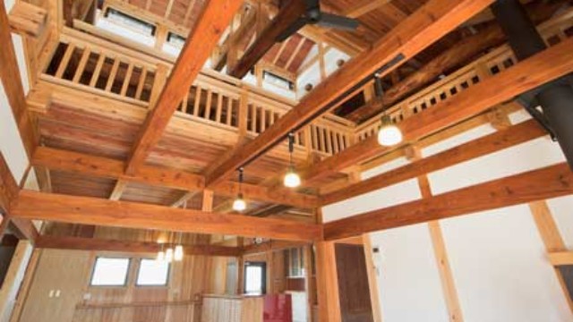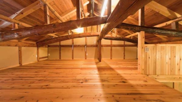 杉板天井と梁の陰影が美しい空間